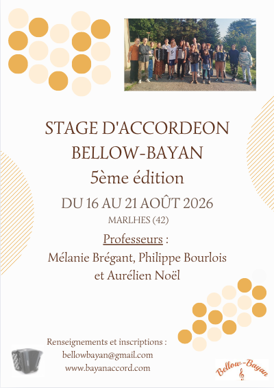 Masterclass de Mélanie Brégant le 22 juin (14-18h), concert du duo Bayanaccord le 23 juin à 18h, précédé d’ensembles d’accordéon de la région